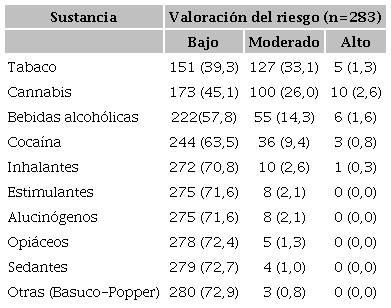 De acuerdo con el cuestionario ASSIST, para cada sustancia que la persona informa haber consumido nos permite calcular el puntaje de riesgo. Este puntaje lo podemos clasificar en tres niveles y en cada caso se determina la intervención más adecuada. Según la clasificación de riesgo, se encontró un predominio del riesgo bajo de presentar problemas relacionados con el consumo de SPA, aunque los soldados podrían ser consumidores de sustancias de vez en cuando. Nótese que el riesgo moderado de los consumidores de tabaco, cannabis y bebidas alcohólicas fue 33,1, 26,0 y 14,3 % respectivamente, lo cual generó una alerta temprana de problemas de salud y de otro tipo. Aunque el riesgo alto de consumo de sustancias psicoactivas es significativamente menor con respecto a los otros tipos de riesgo, sobresalieron el consumo de cannabis (2,6 %), tabaco (1,3 %) y bebidas alcohólicas (1,6 %) (tabla 4).