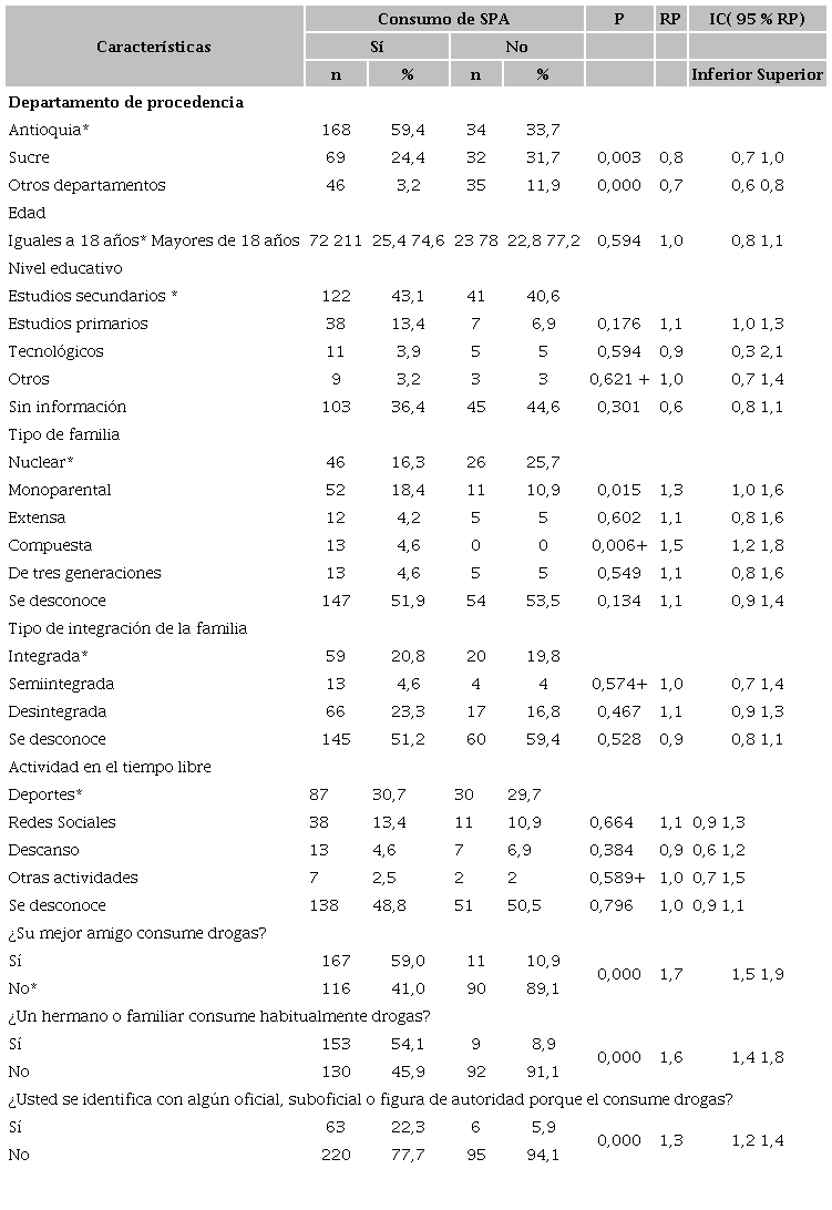 Cuando se consideró la distribución conjunta de cada una las características demográficas, lúdicas y familiares de los soldados regulares, con respecto al consumo de SPA en la vida, se encontró que el departamento de procedencia del soldado se asoció significativamente con el consumo de SPA en la vida. Se observa una disminución en el consumo de SPA de un 20 % en los soldados provenientes del municipio de Sucre ((RP=0,8 IC (95 % RP: 0,7 1,0) en comparación a los asentados en el departamento de Antioquia, mientras que el consumir SPA se reduce en un 30 % en los otros departamentos de procedencia de los soldados (RP=0,7 IC (95 %: 0,6 0,8) al compararlo con los soldados asentados en el departamento de Antioquia.