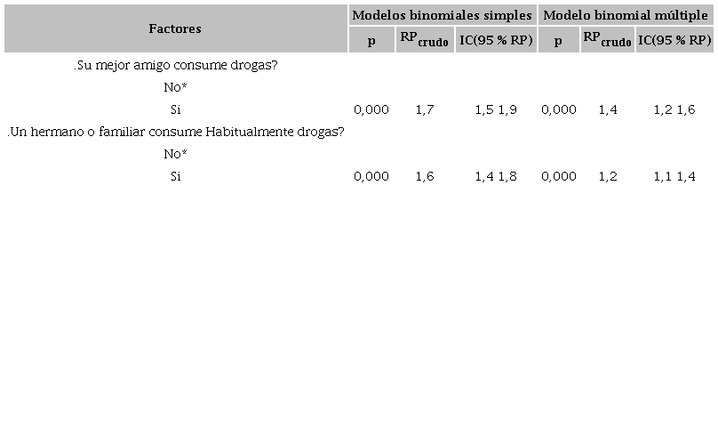 En el análisis multivariado, después de un proceso de selección por pasos, se encontró que los factores que mayor peso presentaron sobre el consumo de SPA en la vida estuvieron relacionados con el consumo de los amigos o de un hermano o familiar; así, si el mejor amigo del soldado consumía drogas, la oportunidad de que él consumiera se incrementaba en un 40 % ajustado por si algún familiar o hermano también recurría a tal práctica (RP=1,4 IC95 % (1,2 1,6)); análogamente, si un hermano o familiar consumía habitualmente drogas, la oportunidad de consumo del soldado se incrementaba en un 20 %, cuando se controlaba por el factor que refería el consumo del mejor amigo (RP=1,2 IC95 % (1,1 1,4)). Nótese que al ajustar por estos dos factores se controlaba el efecto individual de cada uno de ellos en el sentido de que se estaba sobrestimado la oportunidad de consumo (tabla 6).