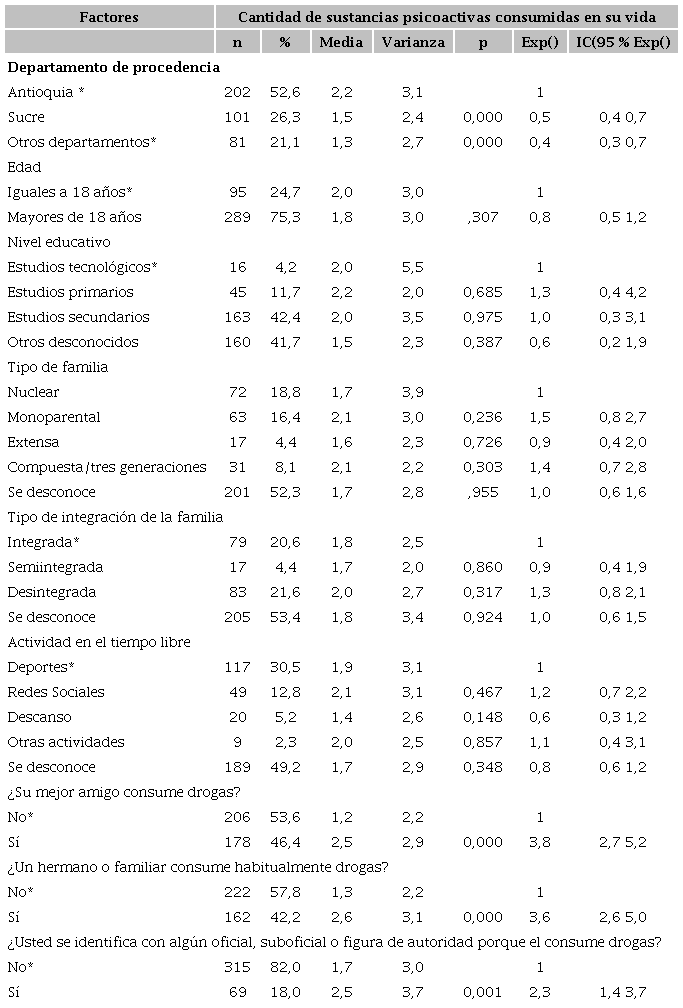 Se relacionó la cantidad de sustancias psicoactivas que el soldado había consumido en su vida, como covariable de conteo, y se relacionó con cada uno de los factores considerados en el estudio, mediante modelos de regresión binomiales negativos. Obsérvese que, en todos los casos, las medias y las varianzas de la cantidad de sustancias consumidas en cada uno de los factores fueron diferentes, lo cual sustenta el uso del modelo. Se encontró un efecto significativo del número de SPA consumidas en la vida de acuerdo con el departamento donde procedía el soldado siendo mayor en los departamentos de Sucre y otros departamentos, en un 50 y 60 %, respectivamente, con respecto al departamento de Antioquia.