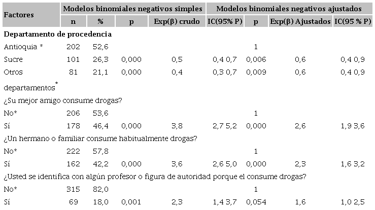 De acuerdo con las variables que cumplieron el criterio de Hosmer Lemeshow, indicadas en la tabla 8, se construyó un modelo de regresión binomial negativo múltiple, paso a paso, en el cual se obtuvo que el departamento del que procedía el soldado, el consumo de drogas por parte del mejor amigo, de un familiar o hermano y de un oficial o suboficial o figura de autoridad fueron los factores que mejor explicaron la cantidad de drogas consumidas por el soldado en su vida; así, este incremento fue mayor en los soldados que provenían del departamento de Sucre o de otros municipios en un 40 % y en aquellos cuyo mejor amigo, hermano o familiar o suboficial u oficial o figura con autoridad consumían drogas con estimaciones del riesgo de 2,3, 2,6 y 1,6, respectivamente. Nótese que el cambio importante, de más del 10 %, en los factores, con excepción del que refiere la procedencia del soldado, indica que, con el ajuste, se controló la sobreestimación del riesgo observada en la tabla 8, cuando se construyeron los modelos simples. Por ejemplo, si el soldado regular tenía un hermano o familiar que consumía drogas, se incrementaba la cantidad de consumo de las mismas 2,6 veces más cuando se controlaba por las demás (tabla 8).