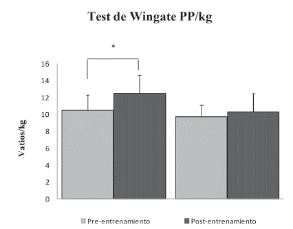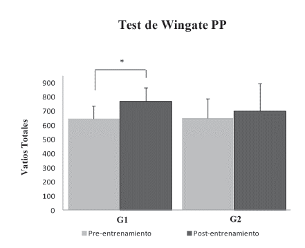 En la tabla 2 se pueden observar los resultados en el test de Wingate obtenidos antes y después del periodo de entrenamiento. No se observó ninguna diferencia significativa entre los dos grupos al iniciar la investigación. Al finalizar el periodo de entrenamiento, se evidenció en el G1 una diferencia significativa en la potencia pico y en la potencia promedio relativa al peso (p=0,001, p=0,004) que mejoró un 18,8 % y un 18,9 % respectivamente (figuras 1 y 2). Además, al finalizar el periodo de entrenamiento y comparar los dos grupos, se observó una diferencia significativa en la potencia pico relativa al peso (p=0,028) en la que se obtuvieron 2,24 vatios/kg más el G2.