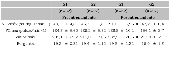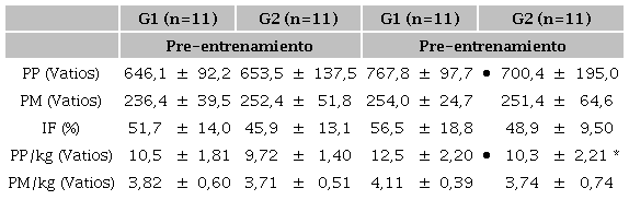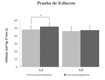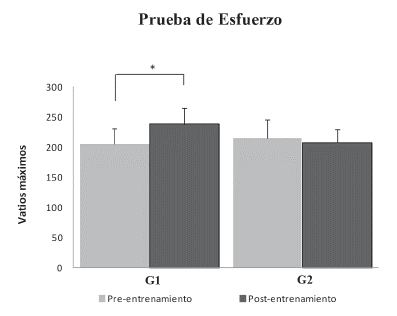 Resultados: Aumentos significativos entre el pre-pos en G1 en VO2máx y vatios que mejoraron 7,6 % y 15,9 % respectivamente, diferencia significativa en la PP y en PM/kg con una mejora del 18,8 % y 18,9 %, respectivamente.