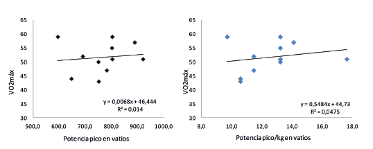 La correlación entre el VO2máx y PP en el test de Wingate mostró un valor de 0,12 y un coeficiente de determinación de 0,014. Así mismo, el VO2máx y PP/g en el test de Wingate mostró una correlación de 0,22 y un coeficiente de determinación de 0,048. Por otro lado, la correlación entre VO2máx y los vatios en la prueba de esfuerzo mostró un valor de 0,68 y un coeficiente de determinación de 0,47. Igualmente, se observó en el test de Wingate entre la potencia pico y la potencia pico relativa al peso con una correlación de 0,87 y un coeficiente de determinación de 0,76.