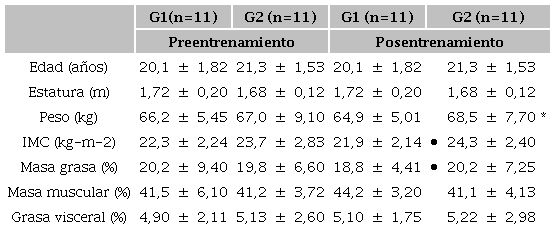 Los datos básicos y antropométricos antes y después de culminar el periodo de entrenamiento se pueden observar en la tabla 1. Al finalizar el periodo de entrenamiento en los sujetos del G1, se evidenció una diferencia significativa en la que disminuyó el IMC (p=0,015) y el porcentaje de grasa (p=0,049). Así mismo, al comparar los dos grupos (G1 vs G2) al finalizar el periodo de entrenamiento, se evidenció una diferencia significativa en el peso (p=0,021).