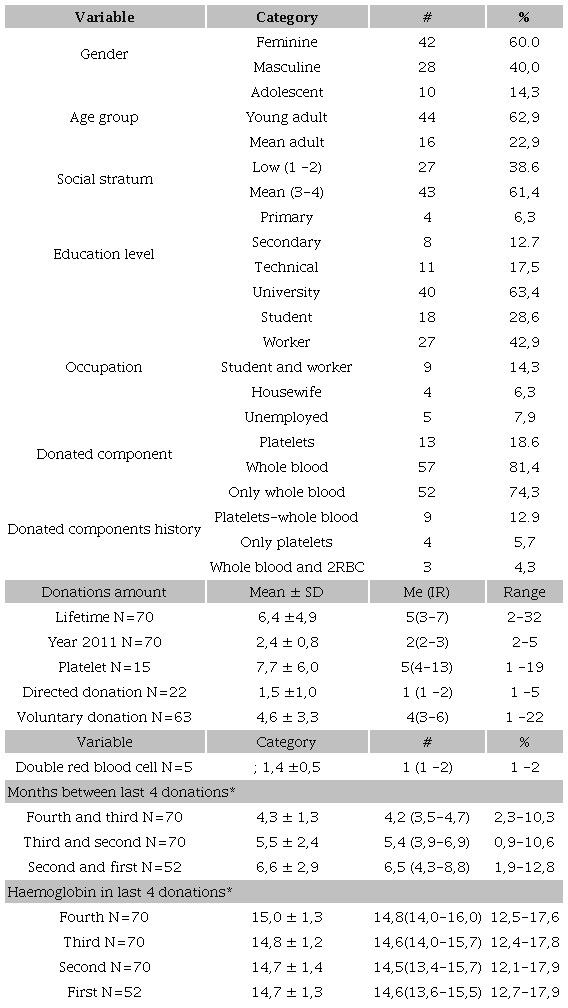 Mean age was 33,1 years±12,5 and the interquartile range was 23-44 years. 60% were women, the most frequent age group was the young adults group (63%), with university degrees (63%), and employees (43%). In the hematologic characteristics, it was observed that the component that was donated the most was whole blood (81%), the average amount of donations was 6,4 over a lifetime, and 2,4 over the last year, with an average time since the last donations which ranged from 4,3 to 6,6 months (Table 1). In the components donated in prior occasions, platelets and 2RBC (double blood cell package) were recorded for an individual, and whole blood, platelets, and 2RBC were recorded for another individual.