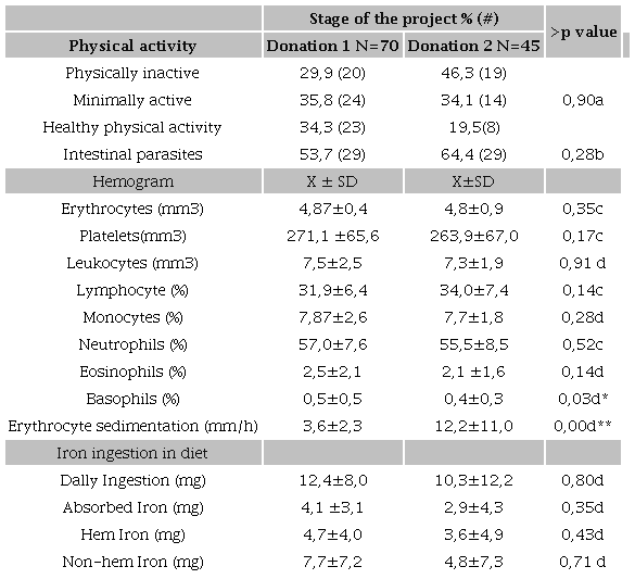 Results: the physical activity frequency, the prevalence of intestinal parasites, the parameter of leuko-plateletgram, and the iron ingestion in the diet did not show statistically significant differences between the two moments of the study, unlike the MCV (Mean Corpuscular Volume), MCHC (Mean Corpuscular Hemoglobin Concentration) and ferritin. In the second stage, ferritin (which decreases as the amount of donations increases) decreased 10% in women and 15% in men.