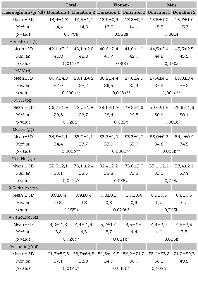 Table 3 show the results comparison of the haemoglobin, the hematocrit, the corpuscular constants, the reticulocytary haemoglobin, and the ferritin in both stages of the study for all the individuals and detailed by gender. In the latter, statistically significant differences were found for the MCV and the MCHC, while there were no such differences for haemoglobin.