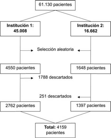 Se realizó un estudio observacional de corte transversal que incluyó pacientes atendidos en el servicio de urgencias en dos instituciones de alto nivel de complejidad en Medellín, Colombia, en el año 2018. Se realizó un muestreo estratificado proporcional al 15 %, en donde los pacientes fueron seleccionados de forma aleatoria. Se incluyeron pacientes mayores de 18 años clasificados en el servicio de urgencias haciendo uso del triaje. Así mismo, se excluyeron las pacientes embarazadas y aquellos pacientes cuyas historias clínicas se encontraban incompletas.