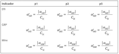 De acuerdo con Crocco et al (2006), el AFCP comprende un procedimiento matemático que transforma un conjunto de variables correlacionadas en un conjunto menor o igual de variables no correlacionadas llamadas componentes principales. En este caso, el AFCP transforma el conjunto de los 3 indicadores correlacionados (DTr, GRP y MInv) en un conjunto de 3 componentes principales, pr , donde r = 1, 2, 3, que varían tanto como sea posible para las 19 localidades.