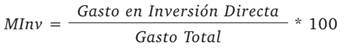 Cuantifica el nivel de inversión realizado en las localidades con relación al gasto total de las mismas, para el caso de las localidades el gasto de inversión corresponde en su totalidad a la disposición de recursos para llevar a cabo las metas establecidas en los programas de cada uno de los objetivos estructurales en el Plan de Desarrollo Local.