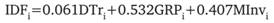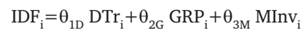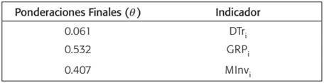 donde θiD es el peso del indicador DTr, θiG es el peso del indicador, GRP, y θiM es el peso del indicador MInv. Una vez que la suma de los pesos es igual a uno (θiD + θiG + θiM = 1), se puede obtener una combinación lineal de los indicadores para calcular el Índice de Desempeño Fiscal para cada una de las diecinueve localidades (IDFi).