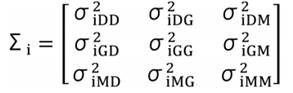 Para obtener los coeficientes de las combinaciones lineales anteriores, el AFCP hace uso de la matriz de varianzas y covarianzas de los 3 indicadores , DTr, GRP y MInv, la cual se obtuvo con el paquete estadístico SPSS. Esta matriz de varianzas y covarianzas es simétrica, definida no negativa y está dada por: