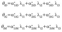 Adicionalmente, el programa SPSS arroja el vector de valores propios (λi1, λi2 y λi3) y la matriz de coeficientes para el cálculo de las puntuaciones en los componentes (αkiD, αkiG y αkiM), para k = 1, 2, 3. Efectuando la suma del valor absoluto de los coeficientes de cada componente se obtiene Cki=|αkiD|+|αkiG|+|αkiM|, y dividiendo cada uno por la suma CKi, asociada a las componentes para recalcular los vectores propios, se tiene que: