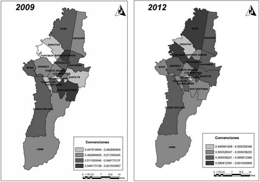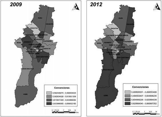 Como se observa en la tabla 6, las localidades tanto en el año 2009 como en el 2012 presentaron, en promedio, niveles superiores al 90%, lo que significa alta disposición de recursos humanos, físicos y tecnológicos, que permiten dar soporte a los distintos procesos y políticas que se cumplen en el interior de las localidades. También se puede observar que para el año 2012, el índice de Capacidad Administrativa en todas las localidades fue sobresaliente.