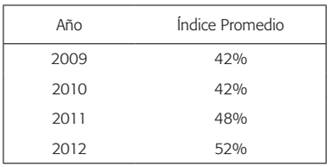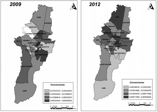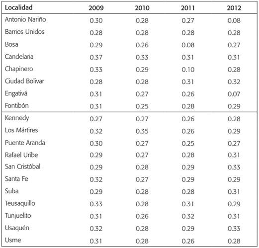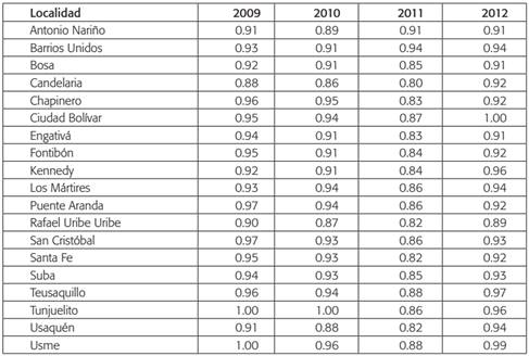 El resultado del índice de Gestión se deriva de una capacidad administrativa en promedio del 91%, pero un débil desempeño fiscal del 28% en promedio, por falta de autonomía. Cabe resaltar las localidades que tuvieron mejor desempeño en el índice de Gestión en el año 2009: Kennedy, Barrios Unidos, Los Mártires y San Cristóbal, quienes presentaron un índice de Gestión superior al promedio (62,3%). Las localidades de Engativá y Antonio Nariño tuvieron los peores índices para este mismo año. Para el año 2010 quienes se destacaron fueron; Usaquén y Bosa. En el 2011 las localidades de Ciudad Bolívar, Los Mártires, Tunjuelito, Puente Aranda y Santa Fe se destacaron con índices mayores al promedio (55,7%). En el año 2012, 11 de las 19 localidades estuvieron en niveles mayores al 60%, resultados superiores al índice promedio de Gestión para este mismo año (figura 2).