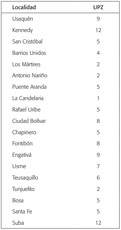 Como estrategia de planificación y en concordancia con el Plan de Ordenamiento Territorial (POT), Bogotá está divida en 20 localidades2 y cuenta con 112 Unidades de Planeamiento Zonal (UPZ)3 (tabla 1), lo cual facilita los estudios y el desarrollo de los procesos que se llevan a cabo de acuerdo con los propósitos del POT, para mejorar la organización espacial y demográfica de la ciudad.
