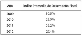 En la tabla 4, se presenta el índice de Desempeño Fiscal promedio de las localidades para el periodo de estudio. Se puede observar que las localidades presentaron un Desempeño Fiscal regular para estos años, mostrando una tendencia decreciente con el pasar del tiempo. En 2011 se presentó el nivel más crítico del indicador promedio para el Desempeño Fiscal, lo cual muestra que la capacidad de las localidades para cubrir sus gastos de funcionamiento con recursos propios no fue posible, dado que con la normatividad vigente estos permanecieron inalterados, y por el contrario, el aumento en la proporción de las transferencias redujo la participación de los recursos propios dentro del total de ingresos corrientes.