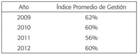 Las localidades en términos de Gestión, presentaron un rango de desempeño superior al 56% y menor al 80%. Se puede observar en la tabla 7 que el índice de Gestión disminuyó en 2 puntos porcentuales del 2009 al 2012, y el nivel más bajo se presentó en el año 2011, efecto directamente relacionado con el nivel del desempeño fiscal bajo que hubo para este mismo año.