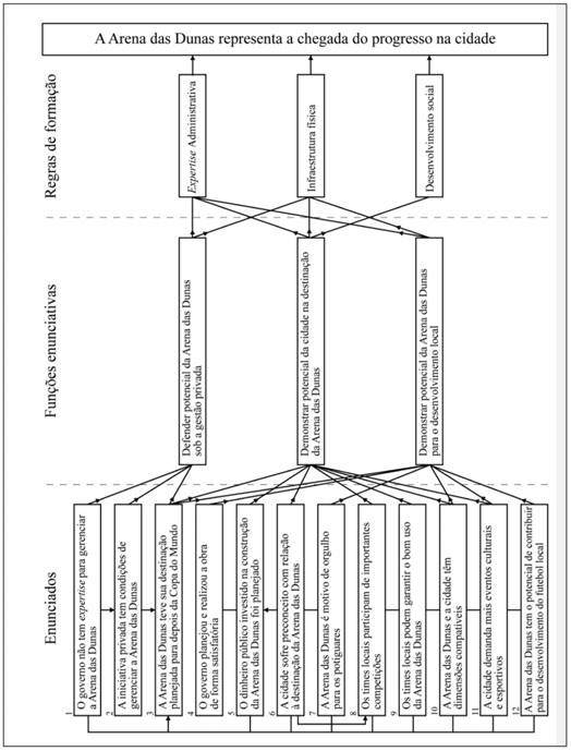 Em relação às funções enunciativas, defender potencial da Arena das Dunas sob a gestão privada se liga a enunciados que afirmam a capacidade da iniciativa privada para a gestão da Arena das Dunas e que, por outro lado, declaram a falta de capacidade do poder público para o gerenciamento do estádio. Demonstrar potencial da cidade na destinação da Arena das Dunas, por sua vez, se liga a enunciados que se referem ao planejamento realizado para utilização da arena e destacam seu uso pelos times locais e sua adequação às demandas da cidade. Por fim, demonstrar potencial da Arena das Dunas para o desenvolvimento local se liga a enunciados que destacam o trabalho bem idealizado da construção da arena e sua capacidade de contribuir para o desenvolvimento da cidade e de seu futebol, sendo motivo de orgulho dos potiguares. Duas regras de formação se relacionam às três funções, enquanto apenas a que destaca o potencial da cidade para a destinação da arena se relaciona à regra desenvolvimento social.