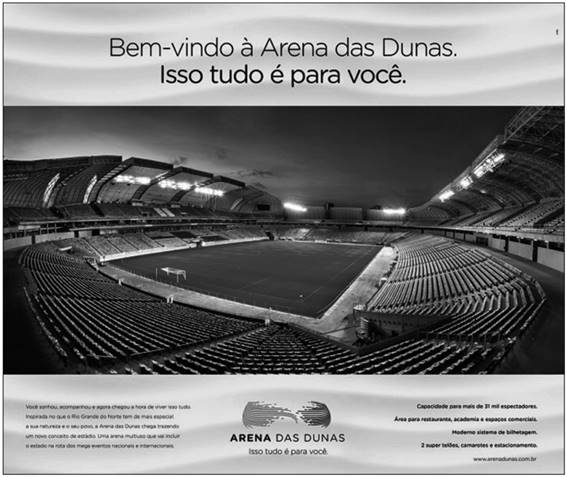 A peça publicitária destaca o equipamento em si (infraestrutura física) em várias frentes. Primeiramente, vale destacar que o anúncio é assinado pelo consórcio, o que indica que a iniciativa privada tem condições de gerenciar a Arena das Dunas, que tem a função de defender o potencial da arena sob a gestão privada. O texto em si do anúncio primeiro evoca o sonho do potiguar em ter a arena e sua oportunidade de vivenciá-la e, na sequência, o estádio é associado à natureza e ao povo do estado, argumentos (enunciados) de que a Arena das Dunas é motivo de orgulho para os potiguares e que teve sua destinação planejada. Esse aspecto também está presente quando as características da arena são apontadas como capazes de realizar grandes eventos, o que indica que a cidade os demanda. Esses enunciados têm a função de demonstrar o potencial da cidade na destinação da arena e desta para o desenvolvimento local.