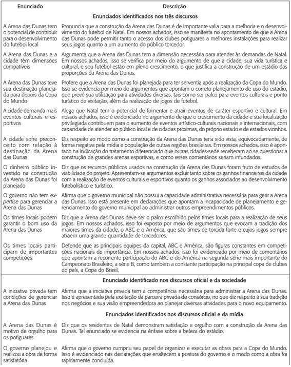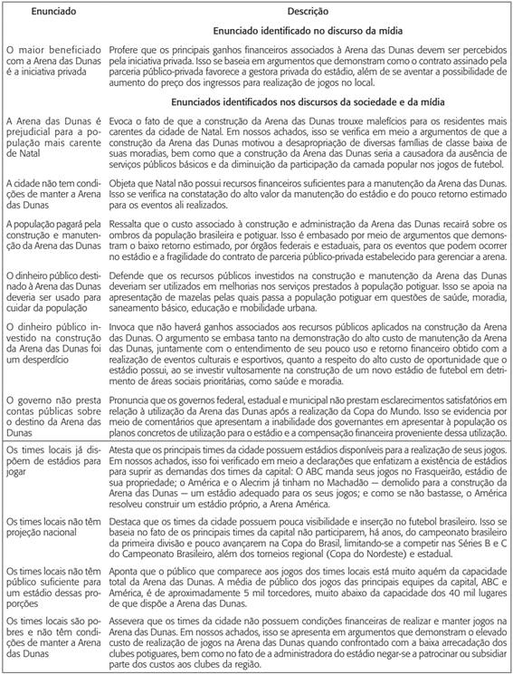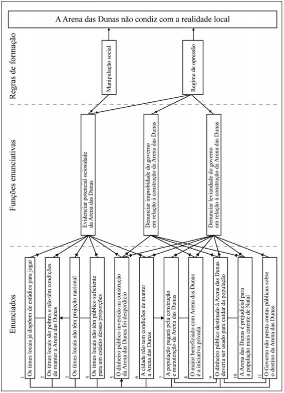 Nossa análise nos levou à identificação de duas formações discursivas. Das cinco regras de formação, três são favoráveis ao investimento feito na Arena das Dunas e valorizam a maneira como ela foi realizada e os benefícios que o equipamento deve propiciar à cidade, enquanto as outras duas contestam tal investimento e denunciam o mau uso do dinheiro público e a manipulação da opinião pública. O mesmo ocorre em relação às funções enunciativas e aos enunciados: três funções e 12 enunciados dão coro ao primeiro grupo de argumentos e outras três funções e 11 enunciados ao segundo.