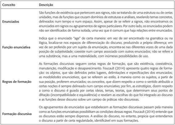Como método, adotamos a análise de discurso foucaultiana, com base em sua analítica arqueológica, que se propõe à descoberta das condições de possibilidade de certos saberes (Foucault, 2014). Tal abordagem se debruça sobre discursos de forma a compreender certas formações ali presentes, a partir da identificação de seus enunciados. Foucault (2014) apresenta as formações discursivas como grupo de enunciados, dotados de funções, que seguem certas regras. Essa definição revela as categorias analíticas trabalhadas pelo filósofo, das quais passaremos a tratar, já traduzindo como são trabalhadas em nossa pesquisa (quadro 1).