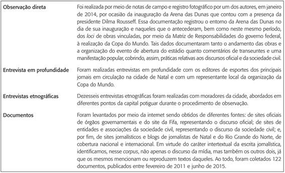Ao conjunto de dados utilizados para a análise de discurso Foucault (2014) denomina arquivo. Segundo o autor, se trata de um conjunto de práticas discursivas que permite o surgimento dos enunciados. O arquivo foi constituído por dados coletados por meio de observação direta, entrevistas e dados documentais (quadro 2) e foi organizado em três categorias: o discurso oficial, referente às práticas discursivas de agentes e instituições ligados à organização do evento; o discurso da sociedade civil, referente às práticas da população e de órgãos criados para fiscalizar a organização do evento; e o discurso da mídia, relativo às práticas discursivas da imprensa acerca de sua cobertura da organização do evento.