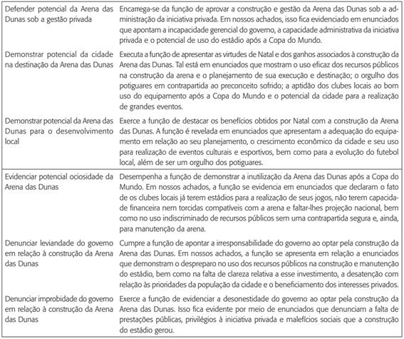 Quanto às funções enunciativas, denunciar improbidade do governo em relação à construção da Arena das Dunas se liga a enunciados que indicam a falta de compromisso da gestão pública e seu beneficiamento à iniciativa privada. Os enunciados que se ligam a denunciar leviandade do governo em relação à construção da Arena das Dunas corroboram esses aspectos e acrescentam a falta de necessidade dos investimentos e de clareza em seu uso. Por fim, evidenciar potencial ociosidade da Arena das Dunas se liga a todos os enunciados sobre os times locais e ao problema da verba investida na construção e requerida à manutenção.