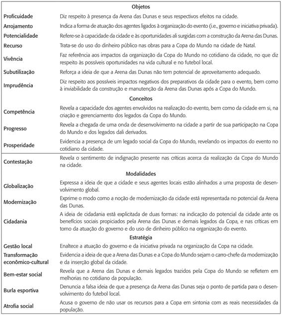 A formação discursiva está alinhada à presença de um modelo universal de desenvolvimento em torno da proposta dos megaeventos esportivos e defende a modernização da infraestrutura da cidade, a troca de experiências e expertises de elaboração e gerenciamento de obras e eventos de tal tamanho e, principalmente, os legados (que serão deixados para a cidade e sua população), representados pelas obras de mobilidade e daquelas ligadas ao turismo. Entretanto, identificamos como obra mais significativa a Arena das Dunas, que ilustra o conceito de arena multiuso e representa uma nova fase para o futebol brasileiro.
