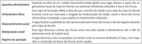 Desenvolvimento social faz referência a um dos principais objetivos da implantação do modelo de desenvolvimento: a vida da população. O feixe decorrente dessa regra pode ser ilustrado na entrevista do representante da organização da Copa na cidade (ver trecho a seguir): ao ser questionado sobre os potenciais usos da arena, o entrevistado argumenta sobre a presença de shows na cidade.