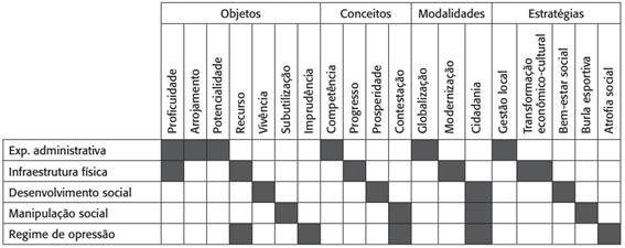 O terceiro grupo de elementos diz respeito às regras de formação (quadro 5). Primeiramente, apresentamos os critérios componentes (objetos, conceitos, modalidades e estratégias) das regras identificadas. Para tal, utilizamos substantivos ou locuções substantivas, por se tratarem de termos referentes a tais critérios, acompanhados de uma breve descrição.