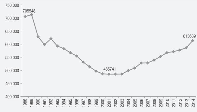 A primeira variável relevante para analisar o quadro de pessoal é justamente seu quantitativo dos servidores ativos do Poder Executivo. Considerando o papel crucial que a Constituição Federal de 1988 desempenhou na estruturação do quadro de pessoal, o gráfico 1 ilustra essa evolução a partir dessa data até o fim de 2014.