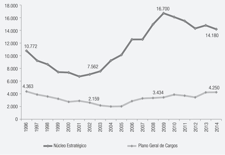 O cenário se altera com a política salarial do governo entre 2003 e 2009. Com forte valorização das carreiras do núcleo estratégico, também denominadas típicas, que obtiveram incremento de aproximadamente 230% da remuneração em valores reais. Desde 2010, entretanto, os aumentos nominais dessas carreiras não conseguem fazer frente à desvalorização inflacionária, logo, as remunerações vêm perdendo seu poder aquisitivo. Por outro lado, os servidores do Plano Geral de Cargos não tiveram reajustes até 2005, todavia nos últimos 10 anos o aumento ultrapassou os 80%.