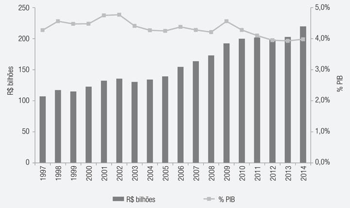 Naturalmente, a política salarial não apenas é determinada pelo contexto orçamentário-financeiro das contas públicas e pelo crescimento da economia, mas também exerce impacto sobre ambas as variáveis. Nesse sentido, os gastos com pessoal devem ser analisados sob o ponto de vista da sua sustentabilidade. O gráfico 3 ilustra a evolução dessas despesas entre 1997 e 2014. Com valores deflacionados, as barras representam a evolução da despesa em valores absolutos (R$ bilhões), enquanto a linha se refere ao percentual da despesa em relação ao PIB brasileiro.