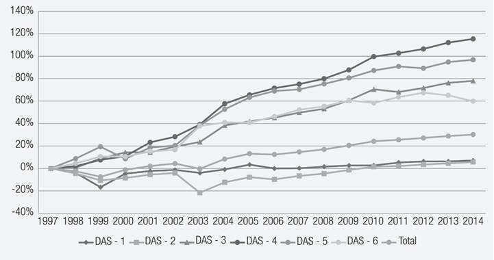 Outra questão importante sobre os DAS é sua configuração em termos quantitativos. O gráfico 4 retrata a evolução percentual de cada um dos seis DAS existentes, bem como o seu total entre 19978 e 2014.