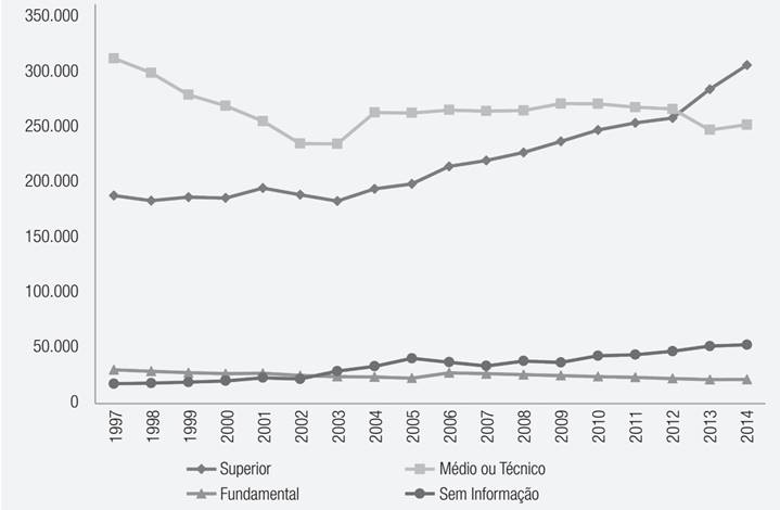 A tendência de maior escolaridade observada no perfil dos servidores também reflete as mudanças da política de ensino superior no Brasil ocorridas no período. De acordo com o censo do ensino superior (Inep, 2013), a taxa de matrículas entre 1995 e 2013 foi quadruplicada, com predomínio da rede privada e, mais recentemente, retomada também de vagas no ensino público.