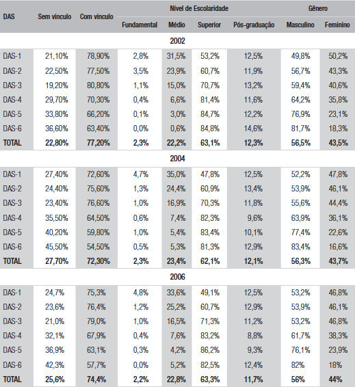 Ao analisarmos a evolução dos DAS nos últimos anos, não é possível também observar alteração significativa na dinâmica de ocupação desses cargos por servidores sem vínculo, uma vez que desde 1998 correspondem a aproximadamente 25% do quantitativo total. Notam-se, contudo, diferenças entre os próprios cargos, justamente pelo fato de representarem níveis de competência e complexidade diferenciados. Nos cargos de DAS 1 a 3, os percentuais de ocupantes sem vínculo tendem a ser menores, o que pode ser creditado à sua remuneração mais baixa e, logo, exerce pouca atratividade aos profissionais da iniciativa privada, sobretudo os não residentes na capital federal - Brasília. Por outro lado, os DAS 4 a 6 apresentam uma participação maior desse público, não apenas pelos benefícios pecuniários, mas também pelo fato de constituírem cargos de maior responsabilidade e, por conseguinte, envolverem características de natureza política fundamentais à dinâmica democrática. Por essa razão, naturalmente, quanto maior o cargo em comissão, menor a participação de servidores públicos de carreira. Entretanto, observa-se que esse último representa a maioria dos ocupantes de DAS alto, parcela que vem crescendo a cada ano.