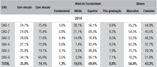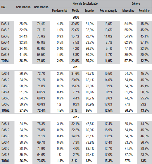 Todavia, os dados empíricos desmentem tal percepção, ou seja, a maior parcela dos DAS é provida por servidores de cargos e carreiras do Estado, principalmente do governo federal, conforme fica evidente na tabela 1 do Anexo, elaborado a partir dos dados do Boletim Estatístico de Pessoal (BEP) (Brasil, 2015).