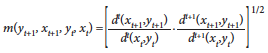 (3)Nesse problema de envelopamento que recorre a menos restrições que a forma original do problema, λ é um vetor Nx1 composto pelas constantes de intensidade λi , enquanto o valor de θ endogenamente mensura a ineficiência do estado em questão, de forma que um valor nulo implicaria um ente federativo na fronteira de eficiência. Este problema é resolvido N vezes, uma para cada ente federativo. Após resolvido esse problema T vezes, uma para cada período do painel, Fare e colaboradores (1994) especificam um índice que mensura a mudança de produtividade de Malmquist entre os períodos t e t+1, que é dado pela relação a seguir, a qual consiste em uma média geométrica das funções distância em t e t+1: