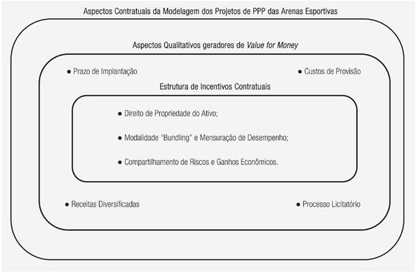 Diversos arranjos contratuais entre instituições públicas e organizações privadas podem ser adotados na provisão de bens e serviços públicos, incluindo equipamentos esportivos. Diante disso, os governos passaram a buscar novas modalidades de provisão, mediante o envolvimento da iniciativa privada na provisão de bens e serviços públicos e, nesse contexto, surgem as PPP como um arranjo organizacional híbrido formado entre o setor público e a iniciativa privada. Duas dimensões são essenciais na compreensão do potencial das PPP: value for money e incentivos.