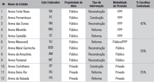 No caso brasileiro, a escolha do Brasil como sede da Copa do Mundo Fifa 2014, em outubro de 2007, colocou o país em posição de destaque no cenário internacional em função da elevada visibilidade do evento, inequivocamente objeto de interesse por parte de muitos países nas últimas décadas. Eventos esportivos dessa natureza, no entanto, geralmente exigem elevados investimentos para construção ou adequação de uma série de equipamentos, notadamente estádios de futebol e infraestrutura complementar. Diante disso, frequentemente são necessários aportes governamentais por meio do envolvimento em suas diferentes esferas. Após a definição das 12 cidades-sede do torneio em maio de 2009, a disponibilização de estádios em padrões de excelência tornou-se uma demanda latente diante do estado decadente das praças esportivas brasileiras. De fato, nove de 12 estádios de futebol brasileiros escolhidos para sediar o megaevento esportivo possuíam antigas infraestruturas com idade média de utilização de aproximadamente 55 anos.1 Seguindo a tradição de outros megaeventos esportivos (Roche, 2000; Cabral e Silva Jr., 2013; Preuss, Solberg e Alm, 2014), o setor público teve um papel preponderante na provisão de nove dos 12 estádios previstos para sediar os jogos do megaevento, com destaque para a utilização da modalidade de PPP para a provisão de cinco dos 12 estádios de futebol.