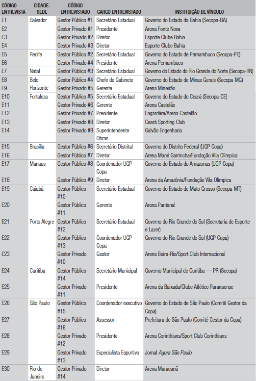 Na fase de coleta dos dados primários, foram realizadas 30 entrevistas semiestruturadas3 junto aos agentes públicos e privados envolvidos na execução da construção das 12 arenas esportivas (16 gestores públicos e 14 gestores privados), totalizando a gravação de 28 horas e 48 minutos de áudio de entrevistas. Já a escolha dos atores-chave entrevistados realizou-se com base em critérios de posição formal ocupada nas instituições públicas e privadas envolvidas na gestão dos projetos (quadro 2). Naturalmente, a disponibilidade dos informantes privilegiados limitou a expansão da amostra, o que foi compensado pela análise documental.