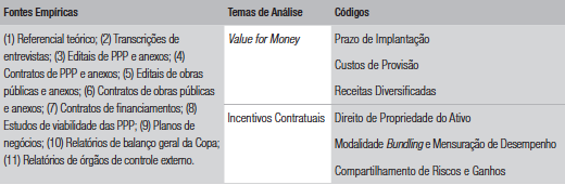Verificou-se que os avanços na análise de value for money sugerem que os aspectos qualitativos na comparação de projetos e as avaliações após a assinatura do contrato proporcionam a análise de dados mais precisos, assim como a sistematização do aprendizado futuro para elaboração e execução de novos projetos de PPP (Coscarelli et al., 2014). Complementarmente, a abordagem metodológica de estudo de casos foi utilizada visando aprofundar os conhecimentos acerca das semelhanças e diferenças dos projetos de PPP, visando sedimentar o conhecimento empírico por meio da sistematização teórica da temática do presente estudo (Yin, 2001). Nessa perspectiva, o percurso metodológico para a coleta e o tratamento dos dados seguiu quatro fases: análise documental, entrevistas semiestruturadas, observação participante em eventos públicos relacionados com a Copa Fifa 2014 e análise de conteúdo.