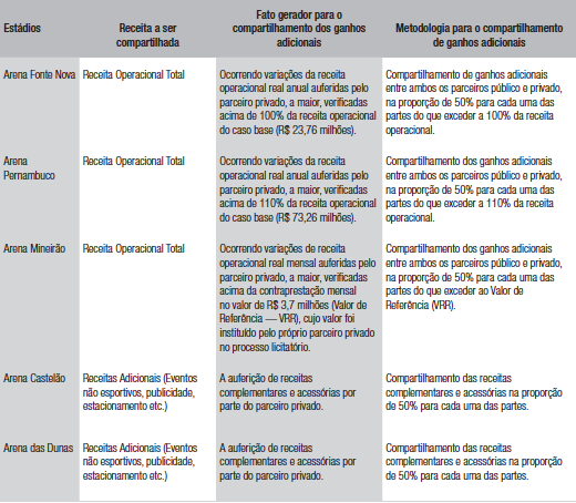 Adicionalmente, três dos cinco projetos de PPP que apresentaram os melhores padrões de desempenho em termos de cumprimento de prazo e custos (Arena Mineirão, Arena Castelão e Arena das Dunas) são projetos para os quais o poder concedente atribuiu 100% da carga dos riscos de construção ao parceiro privado. De forma contrária, os dois projetos de PPP (Bahia e Pernambuco) que tiveram o pior desempenho nesses dois indicadores, se comparado com os demais projetos de PPP analisados, são os projetos em que os entes públicos assumiram uma maior carga desses riscos em relação aos demais estados. A implicação foi clara: desembolsos públicos adicionais não previstos inicialmente para os governos estaduais de Bahia e Pernambuco. Já com relação à operação dos estádios, verifica-se que a maior assunção dos riscos de demanda por parte do poder concedente baiano e pernambucano contribui para o potencial aumento dos desembolsos públicos futuros, caso os parceiros privados não aufiram o fluxo de caixa mínimo estabelecido no contrato de PPP (tabela 3). Por outro lado, o alto grau de risco assumido por atores privados nas arenas de Belo Horizonte, Natal e Fortaleza pode ensejar revisões contratuais futuras, em caso de a demanda real não garantir viabilidade econômico-financeira, no limite fazendo com que os governos desses estados assumam a totalidade da operação e todo seu ônus, caso os parceiros privados não encontrem o equilíbrio financeiro na empreitada. A pesquisa demonstrou que todos os projetos de PPP avaliados adotaram mecanismos para compartilhamento de ganhos adicionais (quadro 4), em caso de a demanda real estar acima do projetado inicialmente, o que pode contribuir para a redução dos desembolsos públicos futuros via deduções na contraprestação pública.