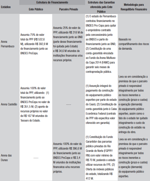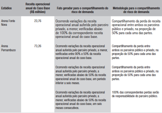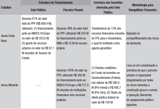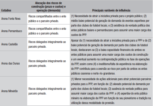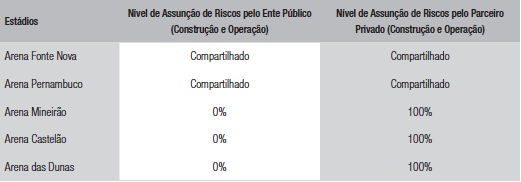 Quanto ao processo de alocação de riscos, verifica-se que diferentes foram os arranjos organizacionais entre o setor público e a inciativa privada, sobretudo no que se referem aos riscos de construção (prazo de implantação e custo de provisão) e aos riscos de operação dos estádios (risco de demanda). Desta forma, chama a atenção o fato de que, em dois dos cinco projetos de PPP, o ente público compartilhou tais riscos, assumindo uma maior carga de riscos em relação aos demais estados (tabela 2).