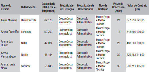 Outra potencial vantagem das PPP observada em relação às obras públicas tradicionais diz respeito ao fato de que todos os editais de PPP foram na modalidade de concorrência internacional, possibilitando que os consórcios licitantes se associassem a empresas estrangeiras detentoras de expertise em gestão de arenas esportivas multiuso, o que de certa forma contribui para maximizar o potencial de geração de value for moneyex post ao longo da execução contratual de tais projetos. Já no caso das arenas esportivas construídas sob a lógica da provisão pública tradicional, a modalidade de licitação adotada em todos os casos foi a concorrência nacional e sem a possibilidade de se ter um gestor internacional com expertise em gestão de arenas multiuso, visto que a Lei no 8.666/1993 impõe o próprio estado como responsável pela gestão operacional do equipamento público esportivo, o que por outro lado contribui para minimizar o potencial de geração de value for moneyex post para a administração pública.