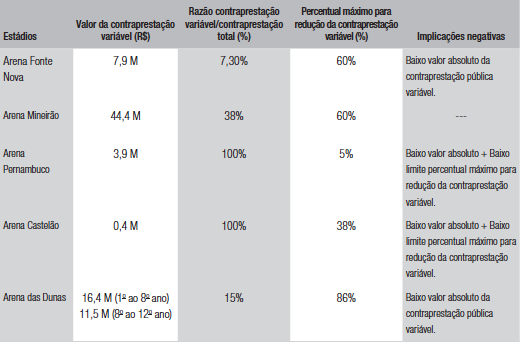 No que se refere à modelagem operacional das PPP, a pesquisa demonstra também que diferentes foram os arranjos organizacionais entre as partes, especialmente em relação aos mecanismos de pagamento da contraprestação pública (fixa e variável). Em três dos cinco projetos de PPP (Bahia, Minas Gerais e Natal), os entes públicos adotaram a contraprestação fixa para amortização dos custos de financiamento e a contraprestação variável para amortização de parte dos custos operacionais das arenas esportivas. Por outro lado, nos demais projetos de PPP (Pernambuco e Ceará), os entes públicos adotaram apenas o mecanismo de contraprestação variável para amortizar parte dos custos operacionais, já que os custos fixos foram quitados no momento da entrega da obra. No que diz respeito aos mecanismos para avaliação do desempenho do parceiro privado, verifica-se que potenciais implicações negativas podem surgir ao longo da execução contratual em função da atual metodologia de avaliação que apresenta baixa penalização ao parceiro privado, em caso de uma eventual avaliação insatisfatória futura (tabela 4).