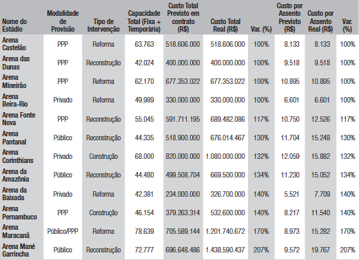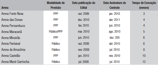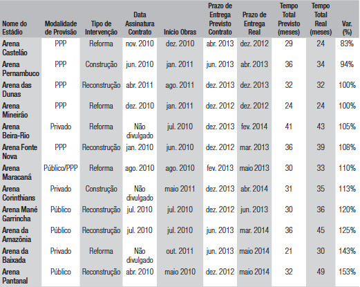 Cabe destacar que a Arena Fonte Nova foi o único projeto de PPP que ultrapassou o prazo de implantação inicialmente previsto em função de novas exigências por parte da Fifa, cujo lançamento (ano 2011) do novo caderno de encargos ocorreu após a assinatura do contrato dessa PPP (ano 2010), acarretando em aumento dos custos do projeto. Por outro lado, chama a atenção o fato de que as PPP de Pernambuco e Ceará finalizaram a obra antes do prazo previsto, em função da decisão política de seus governadores no sentido de antecipar o prazo de construção do estádio para se candidatarem como cidade-sede da Copa das Confederações da Fifa 2013. Tal antecipação não estava prevista e contribuiu para o aumento dos custos da PPP de Pernambuco. Já com relação à Arena Mineirão e à Arena das Dunas, observa-se que ambos os projetos conseguiram finalizar a obra dentro do prazo estabelecido no cronograma inicial, o que pode ser justificado pela modelagem contratual de ambas as PPP.