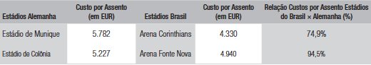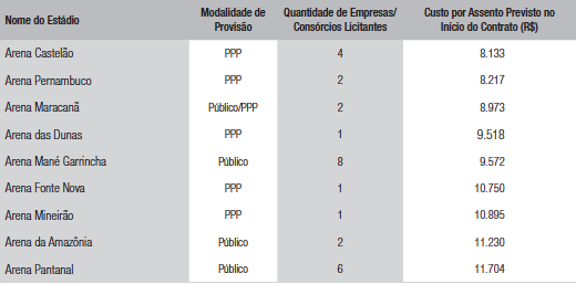 Com base ainda na tabela 9, pode-se inferir que a baixa concorrência, observada nos demais casos das arenas PPP e arenas estritamente públicas, contribuiu para minimizar o potencial de geração de value for money para a administração pública na fase de construção dos equipamentos públicos esportivos. Os resultados da pesquisa, dessa maneira, demonstram indícios de que os custos por assento inicialmente previstos poderiam ter sido minimizados, em caso de uma eventual maior competitividade nos processos licitatórios investigados.